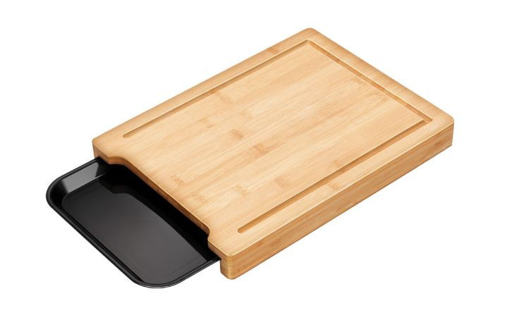 A vágódeszka behúzható tálcával rendelkezik, amely segít az ételek elkészítése közben keletkező hulladék tárolására. A bambusz csatornái elvezetik a használat közben kelektkező folyadékot. Préselt bambuszszálakból készült táblák kemények, gyorsan száradnak, nem szívják fel a nedvességet és nem színeződnek el. Jellemzőik a nagy ellenállóság és nem deformálódik el használat közben.Hosszú élettartamu,kiváló termék.Méretei:36x27,5x4 cm