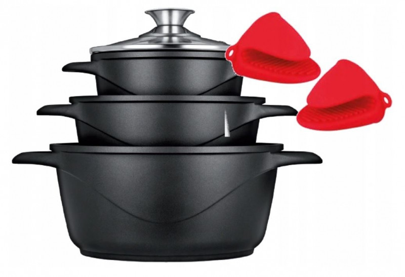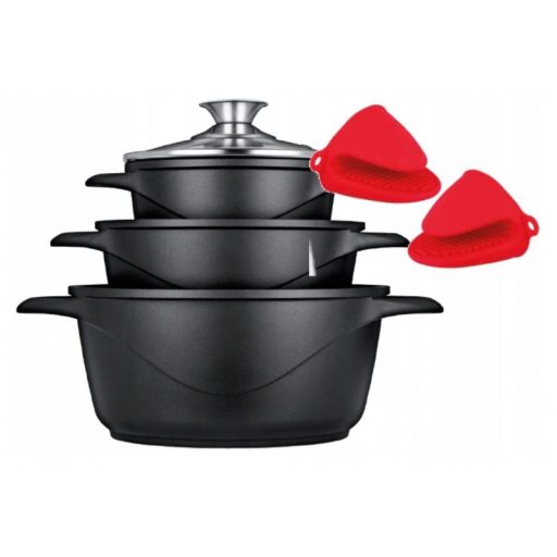 Az MGK-18 egy funkcionális és univerzális főzőkészlet. Három különböző méretű edényből, üvegfedélből és pár szilikon sütőkesztyűből áll.Az edények öntött alumíniumból készülnek. Az alsó és a falak speciális felépítése miatt a hő egyenletesen oszlik el. Ezenkívül az MGK-18 edények belsejét ILAG tapadásmentes bevonattal borítják. Így elkészíthetjük kedvenc ételeinket, anélkül, hogy félnénk őket.Az MGK-18 készlet főzésre, sütésre, párolásra, sőt sütőben történő sütésre is használható. Az edények minden típusú tűzhelyhez használhatók, beleértve az indukciós tűzhelyeket is. Könnyedén mosogathatja őket a mosogatógépben.
