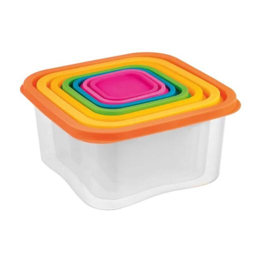 • A készlet 7 négyzet alakú tartályt és színes, szorosan záródó fedeleket tartalmaz