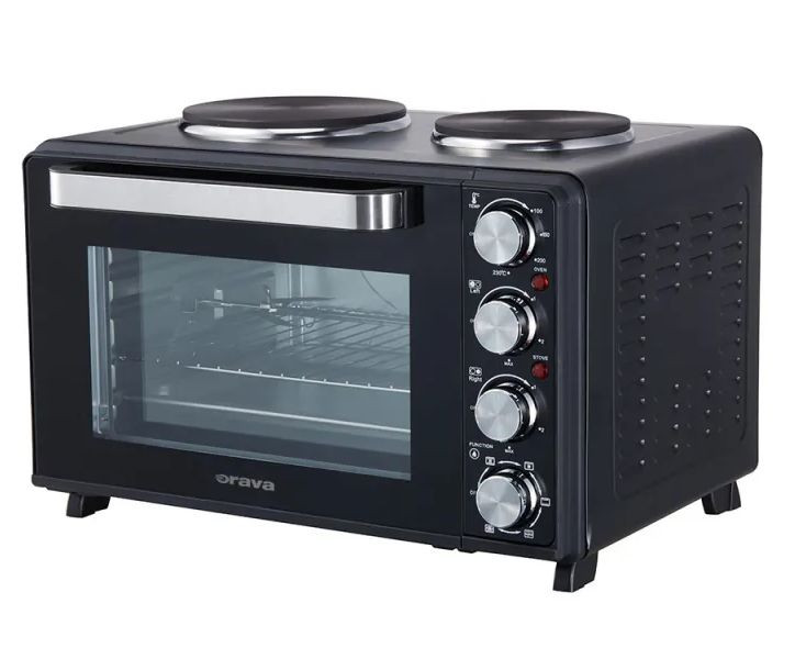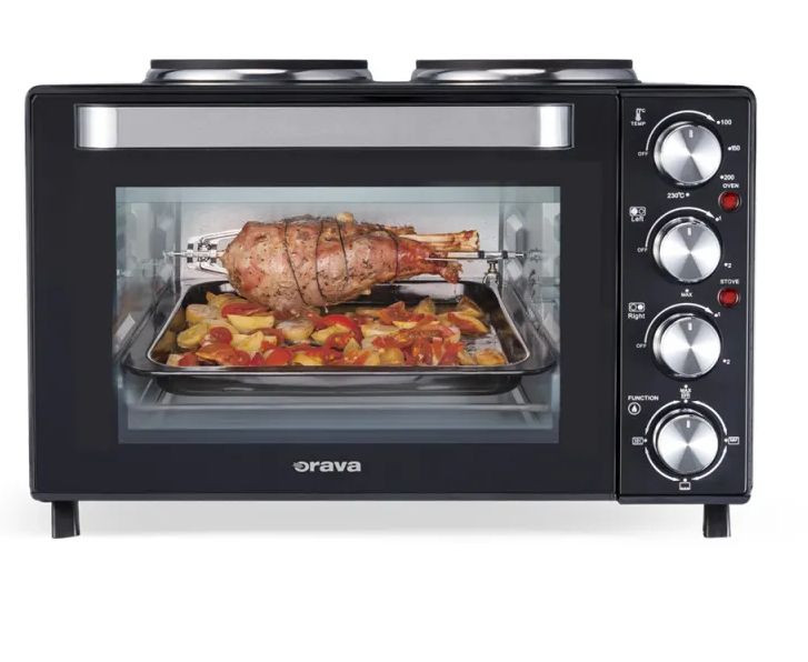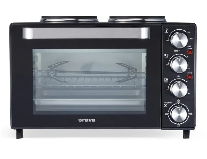 Orava Elektra X30 – egy intelligens és nagyon praktikus kombinációja egy elektromos sütőnek dupla főzőlappal. Lehetővé teszi a főzést, sütést, pirítást vagy grillezést kis helyen, és egyszerre használhatja a sütőt és a főzőlapokat. Bár ez a nagy teljesítményű "séf" kompakt méretekkel rendelkezik, nagy adagokat is képes kezelni – a sütő űrtartalma 30 liter, az öntöttvas főzőlapok átmérője pedig 15,5 és 18,5 cm, így a közepes méretű edények, amelyekben jelentős adag leves és főétel is található, könnyen elférnek rajtuk. Az elektromos sütő tökéletes ételek vagy sütések, például pizza melegítésére. Ennek a dupla főzőlapos elektromos sütőnek a legfontosabb jellemzője a laponkénti független hőmérséklet-szabályozás, valamint a sütő hőmérsékletének 100 és 230°C között történő fokozatmentes beállításának lehetősége. A főzősegéd maximális teljesítménye 3200W. A csomag tartalmaz egy grillrácsot és egy olajcsepptálat is.