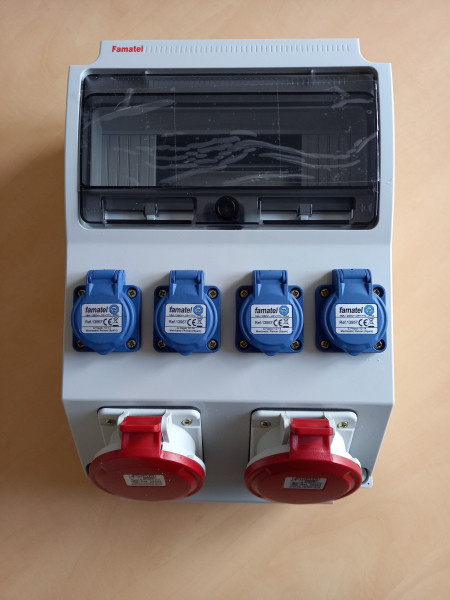 Famatel Szerelt 12 mod.  ipari doboz 400x265x155mm, 4db HT, 1 db 5P 16A, 1db 5P 32A,IP44